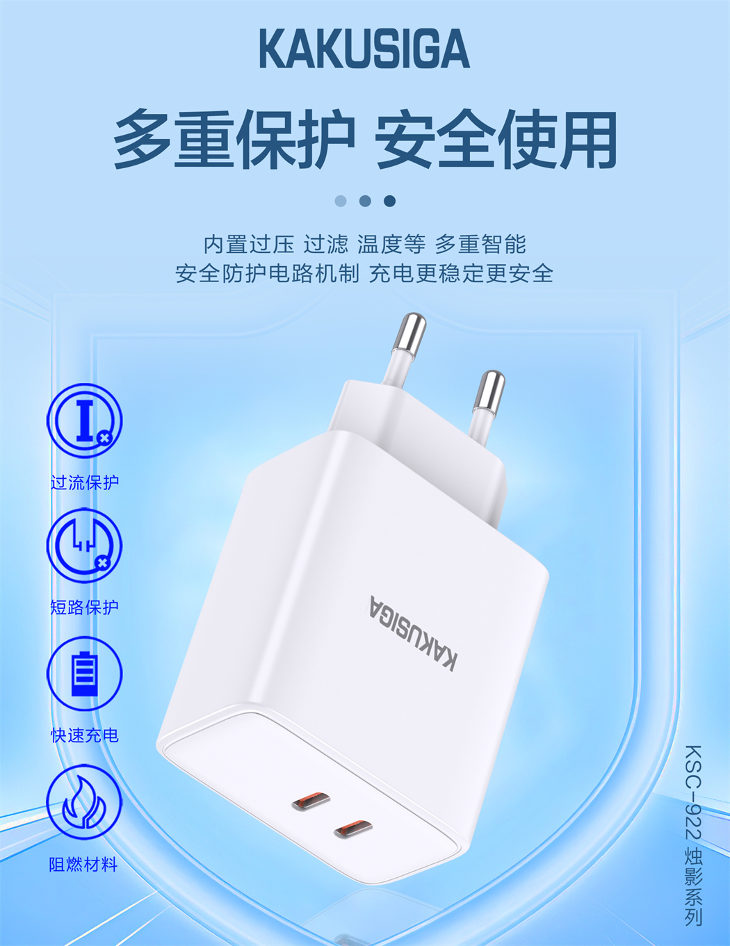 输出:Type-C 1/2:5V/3A 9V/2.77A 12V/2.08A(25W Max); Type-C1+Type-C2:20W+20W