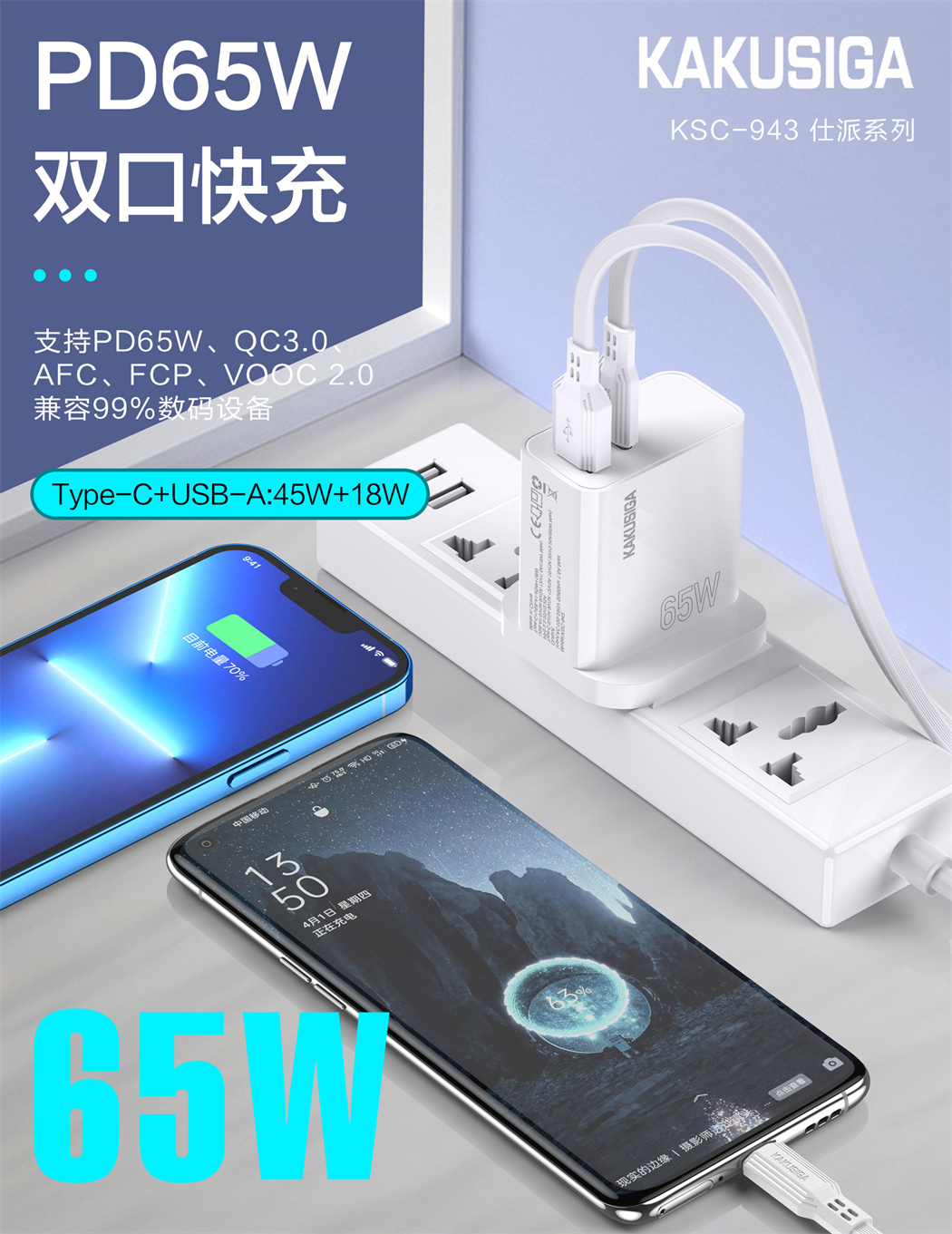 产品名称:仕派系列 PD65W双口快充(1C1A)充电器套装(英规)(Type-C to Type-C)